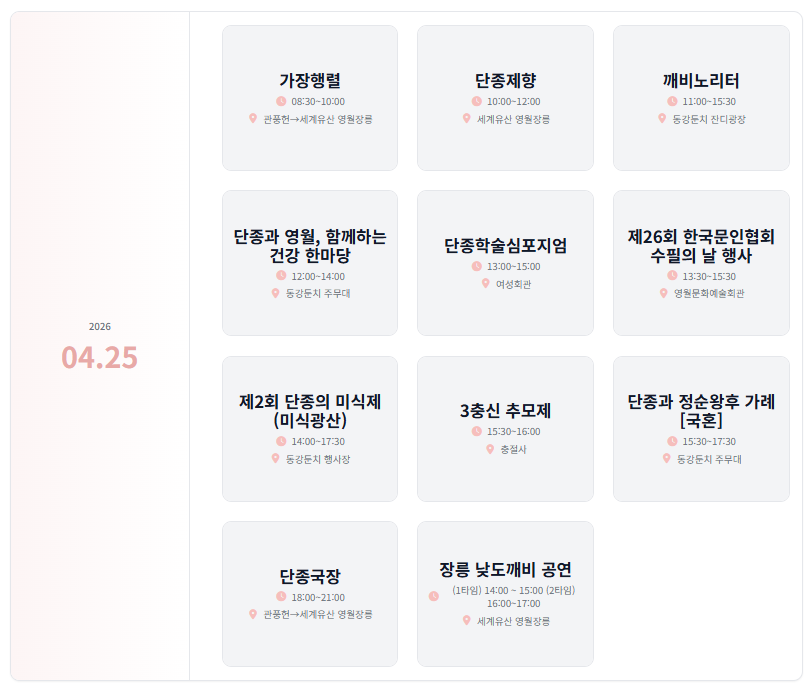 이상으로 영월단종제에 대해 정리해 보았습니다. 사실 저도 처음에는 단순한 지역 행사라고 생각했는데, 내용을 자세히 알아보니 역사적인 의미가 상당히 깊다는 점이 인상적이었습니다. 특히 전통 제례와 퍼레이드를 직접 보면 단순한 관광을 넘어 하나의 문화 체험이라는 느낌을 받을 수 있을 것 같습니다. 다음 여행을 계획하고 있다면 이런 의미 있는 축제를 한 번 경험해보는 것도 좋은 선택이 될 것이라고 생각합니다.